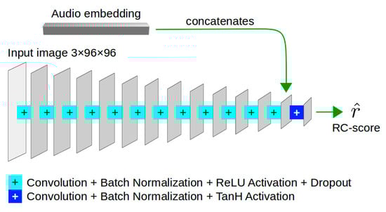 As for the discriminator architecture (Figure 4), it closely resembles the structure of the audio encoder, differing primarily in the input and the shape of the feature maps. Additionally, the last convolutional layer of the discriminator is conditioned with the embedding extracted from the audio encoder. Moreover, dropout regularization is applied after each inner layer. The last convolutional layer directly outputs a scalar corresponding to the RC-score.