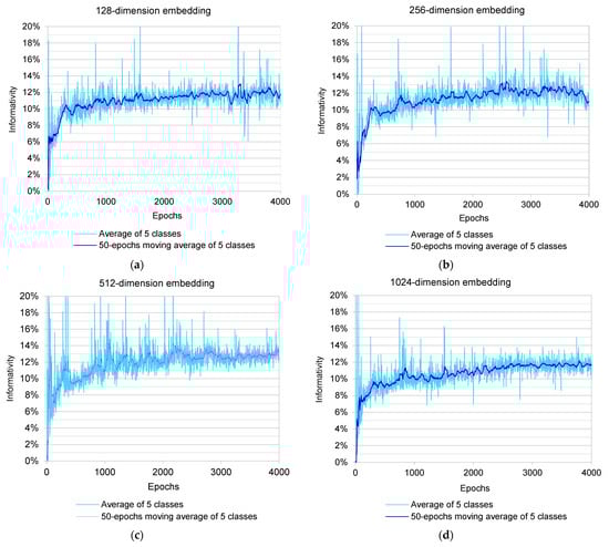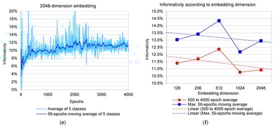 (a–e) Translator’s informativity history for each embedding dimension. (f) Informativity variation according to embedding dimension.