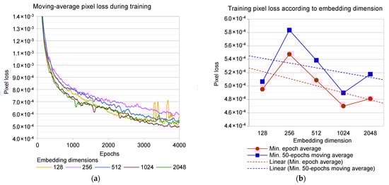 (a) 50-epochs moving-average pixel loss from training for each embedding dimension. (b) Training pixel loss variation according to embedding dimension.