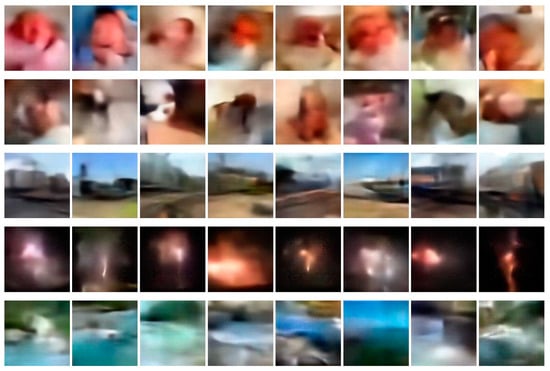 Typical examples of badly translated images from the five sound classes, from left to right column: (a) Baby cry, (b) Dog, (c) Rail transport, (d) Fireworks, and (e) Water flowing. S2I translation was performed from unknown sounds using a single translator model conditioned on 512-dimension audio embeddings.