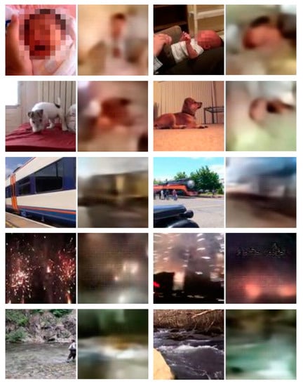 The AudioSet, as described by Gemmeke et al. [], consists of a large-scale audiovisual dataset of manually annotated acoustic events. Starting from the literature and manual curation, the authors defined a structured hierarchical ontology of 632 audio classes to collect data from human labelers. The goal of their task was to probe the presence of specific audio classes in 10 s segments of YouTube videos. The complete dataset contains over 2 million videos and the labeled segments employ part of the AudioSet ontology. The provided data is characterized by its highly diverse audiovisual content. Dealing with such variety makes our study distinct from most previous works. Despite the fact that we use only five sound classes, the sound–image pairs are extracted from over eight thousand distinct scenes, resulting in substantial inter- and intraclass diversity. For training and testing our S2I translator, we employed a subset of AudioSet named VEGAS, made available by Zhou et al. [] for their study on cross-modal image-to-sound translation. This dataset provides cleaner data, in which the starts and ends of addressed acoustic events are precisely annotated. Additionally, the tracks have been inspected to verify whether the elements/events related to the sound were present in both visual and aural modalities, and non-matching segments were removed. The complete VEGAS dataset consists of 28,109 videos of a maximum duration of 10 s, distributed across ten sound classes, among which we use five: Baby cry, Dog, Rail transport, Fireworks, and Water flowing. The original VEGAS dataset is unbalanced; thus, to prevent class biasing, an equal number of segments is used for all classes. Table 1 presents the number of original video tracks for each sound class, along with their corresponding 1 s segments designated for training, validation, and test sets.