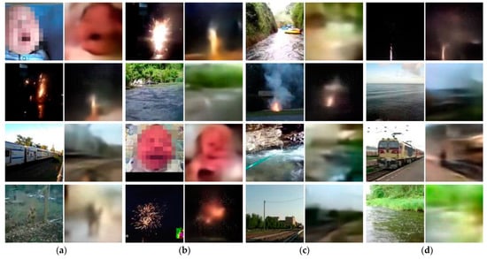 Sharing of similar visual structure (and also color in some cases) between synthesized images and input-sound-corresponding images. Showing examples from the five sound classes: Baby cry—1st row (a), 3rd row (b); Dog—4th row (a); Rail transport—3rd row (a,d), 4th row (c); Fireworks—1st row (b,d), 2nd row (a,c), 4th row (b); and Water flowing—1st row (c), 2nd row (b,d), 3rd row (c), 4th row (d). S2I translation was performed from unknown sounds using a single translator model conditioned on 512-dimension audio embeddings. The babies’ faces in the original images were intentionally pixelated to preserve the children’s identities.