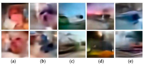 The pixel loss history during the generators’ training is also reported using a 50-epochs moving average (Figure 8a). In general, models trained within a broader latent space showed faster convergence and achieved lower pixel losses (Figure 8a,b), although this tendency was not verified in extreme dimensions 128 and 2048. In spite of that, informativity decreased when the embedding dimension was greater than 512 (Figure 7f). Although in a subtle way, this outcome suggests a possible influence of audio embedding dimension variation on translation performance, and the results seem to point out a trade-off between convergence (in the pixel space) and informativity, with better results observed, respectively, for higher and lower feature space dimensionality. The increased flow of information across the network might have led to model overfitting, which is difficult to confirm, since the generators’ testing losses are uninformative due to the visual decoupling mentioned in Section 5.2. On the other hand, models trained in a more constrained feature space could present poorer convergence, but they generally produced more informative images, especially for intermediate dimensions. We hypothesize that this occurs due to the semantic generalization induced by constraining the information flow between source and target spaces, as demonstrated in previous studies on supervised learning [], generative adversarial learning [,], and domain adaptation [,]. In such processes, the reduction of the latent variable dimensionality forces the network to extract essential semantic information. In the case of cross-modal tasks, this helps bridge source and target modalities by exploiting high-level semantics that connect the two. In S2I translation, the concept of an acoustic event is what links aural and visual modalities, and the entirety of the AudioSet [] structure is based on such concepts. It is also important to emphasize that the proposed S2I translation does not simply prioritize image realism, but also places significant emphasis on informativity.