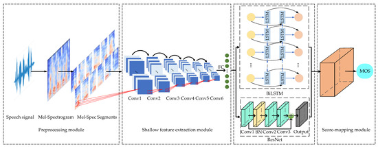 Objective evaluation methods can be classified into intrusive and non-intrusive types. Intrusive models also require the pristine clean version of the speech signal as a reference to estimate the quality of distorted speech signals, such as the PESQ model proposed in ITU-T Recommendation P.862 [5,6]. In contrast, non-intrusive models solely rely on the output signal of the transmission system to estimate the MOS, such as the P.563 model introduced by ITU-T [7,8]. Obtaining the pristine clean version of the speech signal can be challenging in practical communication scenarios. Therefore, non-intrusive objective evaluation has become a hot topic in domestic and international research to ensure real-time and convenience. Non-intrusive models can directly assess distorted speech signals, offering greater flexibility to adapt to different application scenarios and reducing the complexity of the evaluation process [9]. This method holds significant importance for a wide range of speech quality assessment tasks.