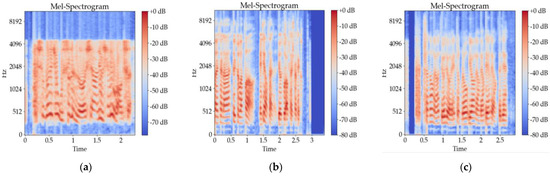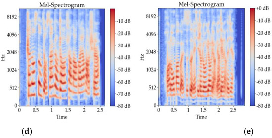 Spectrograms of different MOSs. (a) MOS = 1, (b) MOS = 2, (c) MOS = 3, (d) MOS = 4, and (e) MOS = 5.