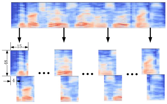 The model utilizes the sliding window technique [21] to divide the input mel-spectrogram features into several overlapping sub-segments, as shown in Figure 3. Since the mel-filterbank consists of 48 bands, the height of each sub-segment is 48. The width of the sub-segment is set to 15 (equivalent to 15 frames, totaling 40 ms), and the hop size between sub-segments is 4 (equivalent to 4 frames, totaling 40 ms) [22]. By employing this segmentation approach, the model processes air traffic control speech at the frame level, enabling more effective capturing of the temporal features of the speech.