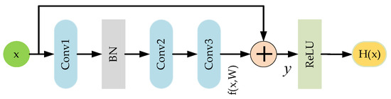 where represents the input from the previous module; is the weight matrix of the convolutional layer; denotes the output after two convolutions of ; represents the residual output; g refers to the ReLU activation function; and represents the output of after passing through the ResNet model.