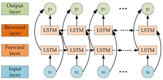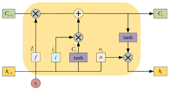 BiLSTM is based on LSTM, which is a type of recurrent neural network (RNN). The design goal of LSTM is to address the issues of vanishing and exploding gradients that commonly occur in RNNs when dealing with long sequence information [29]. LSTM introduces gate control mechanisms, including the “forget gate”, “input gate”, and “output gate” [30], which enable long-term memory when processing long sequence information. The structure of LSTM is illustrated in Figure 5.