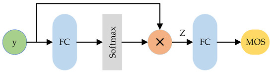 This module weighs the output of the spatiotemporal feature parameter processing module to compute the final speech quality score. The score mapping module, as shown in Figure 7, takes as input a feature matrix of size dtf × L, where dtf represents the feature dimension after processing for each segment, and L represents the number of segments along the time axis. Through a fully connected layer, attention scores are obtained. These scores are masked and normalized using zero-padding and the softmax function. They are then multiplied with the input matrix, y, through matrix multiplication to obtain a weighted average feature vector, z. Finally, z is passed through another fully connected layer to estimate the overall speech quality [33].