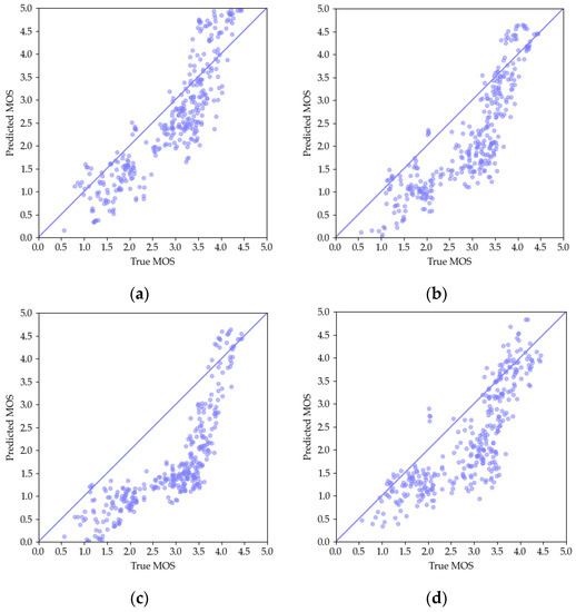 Equation (6) calculates the root-mean-square error between the subjective MOS and predicted MOS. A smaller RMSE indicates the better predictive performance of the model [39].