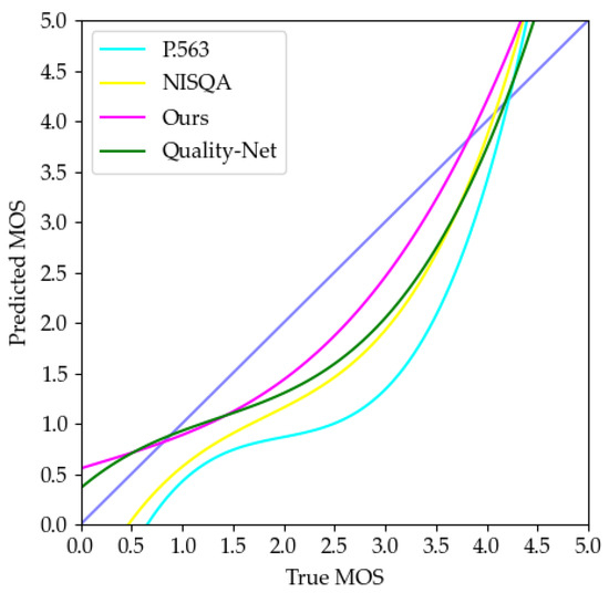 According to the results in Figure 10, it can be observed that compared to the NISQA model, the P.563 model, and the Quality-Net model, the fitting curve of the proposed model is closer to y = x. This indicates that the proposed model has a more accurate prediction of the subjective MOS.