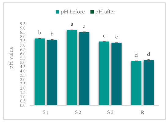 The impact of Salicornia europaea L. cultivation on the pH variation. Values followed by the same letter(s) do not differ significantly at p = 0.05.