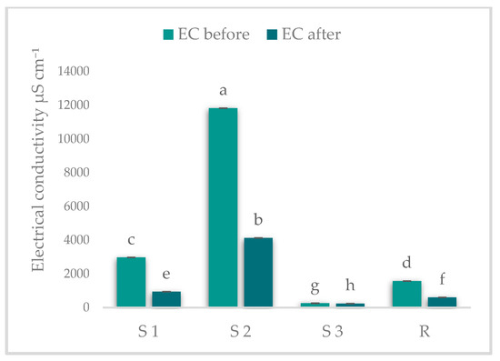 The obtained EC values are presented in Figure 2. It can be observed that the cultivation of Salicornia europaea L. may influence the EC of the soil; for each tested substrate, the differences between the before and after cultivation values are significantly different. This may be due to the ability of the plant’s mechanism to tolerate salt and heavy metal toxicity, having, among other characteristics, a phytoextraction role. In the same way, Salicornia bigelovii [45], Salicornia brachiata, and Salicornia iranica have the same characteristics.