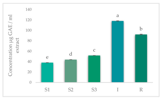 The graphical representation was presented in the form of bars to highlight the difference between the cultivation substrates for the same species. Statistically, the results obtained are significantly different and were calculated for the probability of 0.05. Compared to the phenolic content of the plant grown in indigenous conditions (I = 118.08 µg GAE·mL−1 extract), the highest values of the total phenolic content were 92.18 µg GAE·mL−1 extract) recorded for the plant grown on the R cultivation substrate. The results show that the acidic cultivation substrate R (pH = 5.18) stimulated the accumulation of phenolic compounds. This tendency is according to other published data on pH affecting almost all biological and chemical processes in plants [49]. Considering the purpose of our study, the results showed the possibility of cultivating this species on acidic soils with the aim of capitalizing on plants rich in phenolic content.