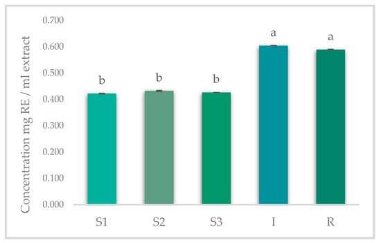 In general, the content of flavonoids differs from one halophyte species to another [38]. In this work, within the same species, multiple variations were identified. Thus, for variants S1, S2, and S3, there were no significant differences, the TFC values varying between 0.422 and 0.426 mg RE · mL−1 extract. Also, no significant differences were registered between the TFC of the indigenous plant (I) and the plant grown on acidic soil (R), the values being 0.604 and 0.589 mg RE · mL−1 extract, respectively. Significant differences were observed between S1, S2, and S3 extracts and those from Salicornia I and R.