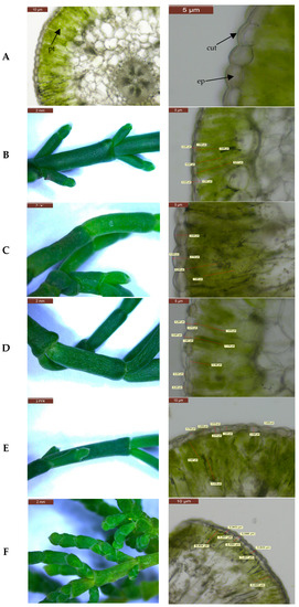 Gallery of microscopy images of Salicornia europaea L. fleshy segment sections from the middle region of the plant. (A) Image of segment section: cuticle (cut), epidermis (ep), and palisade tissue (pt); (B) measurements on I variant; (C) measurements on S1 variant; (D) measurements on S2 variant; (E) measurements on S3 variant; and (F) measurements on R variant.