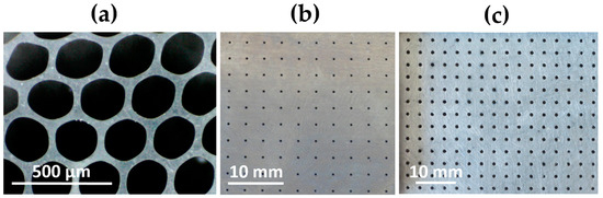 (a) Magnification (factor 10) of MCP2 revealing 60° staggered near-circular micro-channels with diameters of 200 µm and hole pitches of 268 µm; (b) Photograph of UMPP showing aligned distributions of circular holes with diameters of 0.3 mm and hole pitches of 3 mm; (c) Photograph of MPP showing aligned distributions of circular holes with diameters of 0.88 mm and hole pitches of 3 mm.