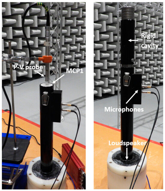 Photographs of the Kundt tube used to measure the absorption properties of an unbacked (left) and rigidly backed (right) MCP in an anechoic environment; a pressure–velocity (p–v) probe characterizes the acoustic radiation of the unbacked MCP.