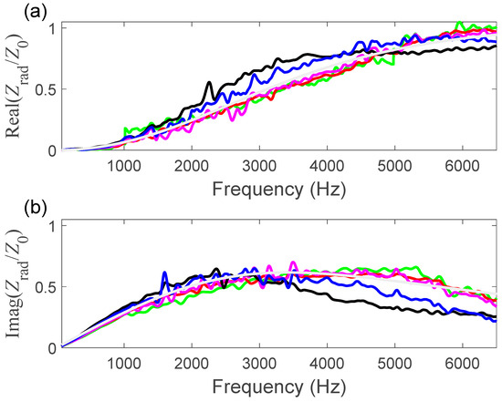 It can be seen from the green curve of Figure 5 that the open termination (reference case) reflects a large amount of the incident energy below 1000 Hz (more than 90%). As the frequency increases, part of the incident energy transmitted by the open outlet gradually rises, reaching unity at 6500 Hz. As shown in Figure 6 (green and gray curves), this open tube behavior is well predicted by the radiation impedance model of Silva et al. [15] described by Equation (6) for a flanged cylindrical termination.