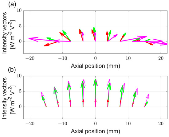 Measured intensity vectors at 300 Hz (a) and at 5000 Hz (b) associated with the acoustic radiation of an open termination (green), MCP1 (red) and MCP2 (magenta).