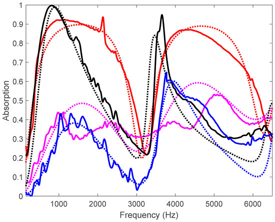 Simulated (dotted) and measured (plain) absorption properties of MCP1 (red), MCP2 (magenta), UMPP (black) and MPP (blue) backed by an open cavity with a depth of 152 mm, assuming normal incidence.