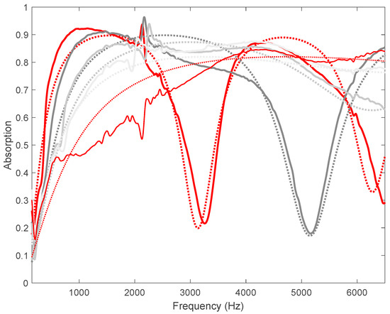 Simulated (dotted) and measured (plain) absorption properties of MCP1 when backed by a rigid cavity with depths of 55 mm (thick red), 35 mm (dark gray), 25 mm (gray), 20 mm (light gray) and 10 mm (thin red), assuming a normal incidence.