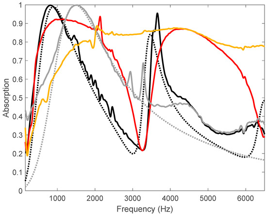 The UMPP and MPP have perforation ratios that are considerably lower than those of MCP1 and MCP2, so they have much larger reactance values than those of MCP1 and MCP2 as the frequency increases. This is verified in Figure 3b when comparing the reactance of MCP1 to that of the MPP. Hence, the UMPP and MPP tend to be reflective at high frequencies, especially the UMPP, whose absorption curve already decays from 400 Hz down to 0.4 at 6500 Hz (Figure 5 (black curve)). Acoustic reflections on the UMPP are more pronounced than those on the MPP due to the perforation ratio of the UMPP that is about four times lower than that of the MPP, as well as due to smaller hole diameters.