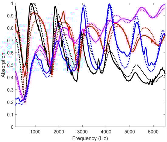 Measurements were carried out for the absorption performance of the four types of materials listed in Table 1 when backed by a rigid cavity with a variable depth, as illustrated in Figure 4 (right). Table 2 summarizes the absorption performance of the individual resonators with , the total absorption evaluated between 80 Hz and ; , the value of the first absorption peak; and , the lower and upper frequencies delimiting the bandwidth at 50% of the maximum of the first absorption peak. Figure 8 presents the measured and simulated absorption results, assuming a cavity depth of 55 mm.