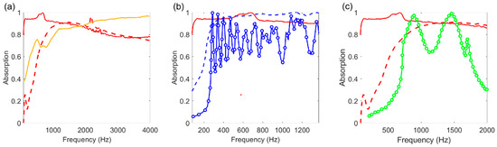 (a) Absorption properties of unbacked MCP1 (plain red), MCP1 backed by a 55 mm cavity depth (dashed red) and a rigidly backed 200 mm anechoic cone of melamine foam (orange, reproduced from Figure 2 in [11]); (b) Absorption properties of unbacked MCP1 (plain red), a 110.6 mm depth metamaterial composed of a parallel array of 4 × 4 quarter-wavelength coiled resonators (blue with circles, reproduced from Figure 2 in [5]) and the same metamaterial covered by a 10 mm sponge (dashed blue, reproduced from Figure 2 in [5]); (c) Absorption properties of unbacked MCP1 (plain red), MCP1 backed by a 35 mm cavity depth (dashed red) and an MPP connected to hollow tubes of variable length in a rigid backing cavity with a depth of 36 mm (green circles, reproduced from Figure 17 in [6]); all the curves are obtained from impedance tube measurements.