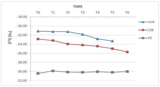 The changes in isotopic composition over time (immersion in seawater) of the shopping bags (ULB and LSB) showed that over the 73-day exposure period and under variable conditions of temperature and salinity (i.e., 24.24–28.76 °C and 31.19–36.28 PSU, respectively), the δ13C values of both Mater-Bi® bags showed a gradual decrease towards more negative values (Figure 1). The recorded δ13C variation (Δδ13C) was 2.16 and 2.84‰ for ULB and LSB, respectively. During the experiment, all ULB and LSB samples showed structural changes with the formation of numerous heterogeneous pinholes, cracks and grooves. The evidence that ULB fragments were not found at T6 is presumably linked to the mechanical action of waves, rather than to chemical degradation [13,29]. The PE control bags did not show a marked decrease of δ13C and their observed δ13C variation (Δδ13C = 0.41‰) was close to the uncertainty of the analytical method, which is different from what was observed for compostable bags.