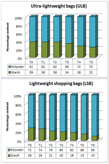 By applying the mixing approach to the isotopic values of the samples (T0–T6), where T0 indicated values relative to the starting composition of the shopping bags, we observed that the percentage of starch fraction decreased at a similar rate in both types of shopping bags, independently of its initial proportion. Indeed, between T0 and T5 (T6 was analyzed only for LSB) 14% and 13% of starch were lost, respectively for ULB and LSB (Figure 2). This implied a progressive enrichment in polyesters in both types of bags, even if ULB showed an initial difficulty in degrading.