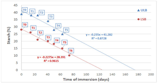 Considering the intercept in the X-axis, we could predict the time necessary for the biodegradation of starch components considering the environmental conditions present during the experiment, estimating it in about 180 and 124 days for ULB and LSB, respectively.