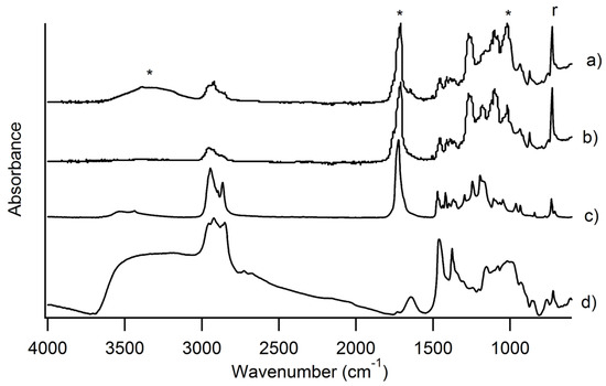 FTIR spectra of (a) ULB, (b) LSB, (c) PEs, (d) starch. The peaks which were integrated are denoted by * in the ULB spectrum; the peak taken as reference is indicated by r in the ULB spectrum.