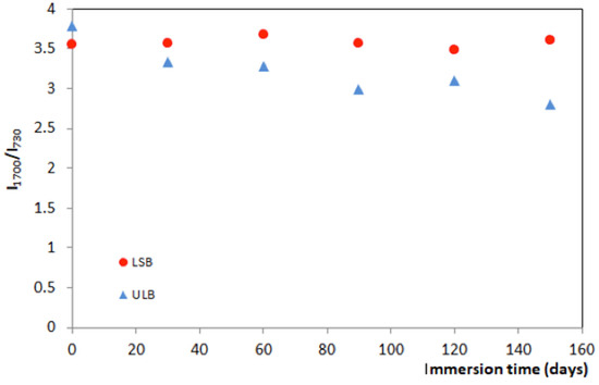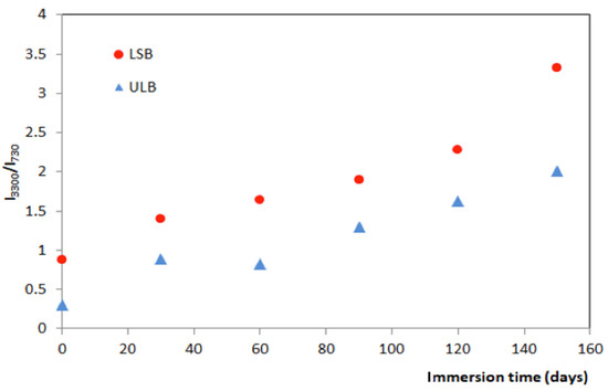 Ratio I3300/I730, related to the quantity of hydroxyl groups as a function of immersion time for ULB (blue triangle) and LSB (red circle).