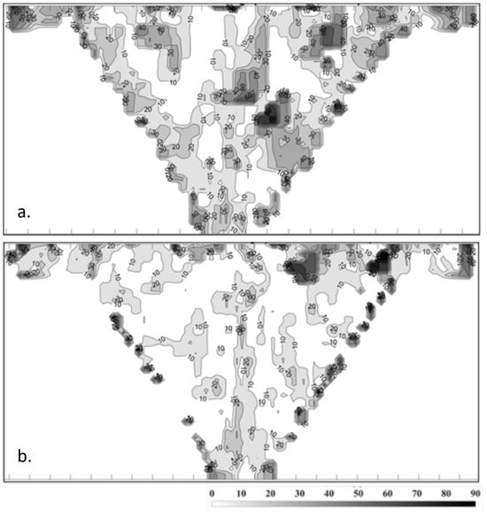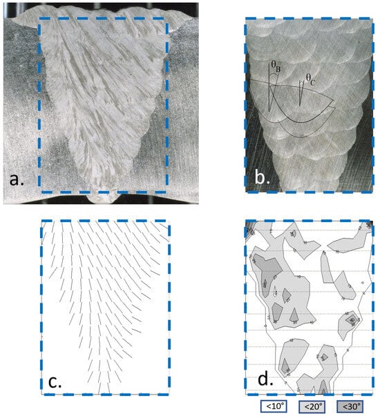 Figure 4 illustrates one of the multiple tests used to verify the model efficiency. An experimented welder has filled in the notebook for a thick multiple-pass weld with 31 passes. In this case, the welding position is horizontal–vertical. Two different chemical etchings reveal grain orientation (Figure 4a) and passes (Figure 4b). Simulated grain orientation is showed in Figure 4c. For image analysis, grain orientations are represented in square meshes of 2 × 2 mm2. MINA parameters are = 0.39, = 0.25, = 36°, = 28° and n = 10. Angle parameters and are more important than those of flat welds. Part (d) in Figure 4 represents differences between measured orientations on micrographs using level lines; the darker areas correspond to higher differences. The MINA model gives orientation maps with an average error of 10 to 15° for classical flat welding, with a standard deviation of 10° [60,61].