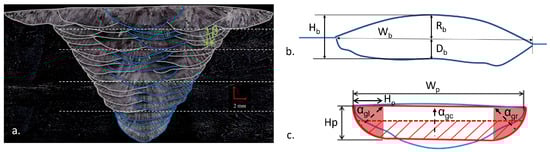 Analysis of GTAW pass morphology. (a) passes shape. (b) bead parameters. (c) simplified geometry for modelling.