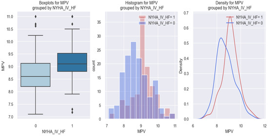 In all three graphic representations of Figure 1, it can be observed that patients with class IV NYHA HF (1) tended to have a higher MPV value (over 9 fl) compared to those without class IV NYHA HF (0) who had MPV values below 9 fl.