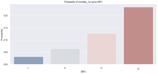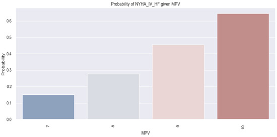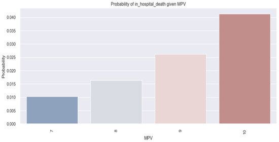 Although the above results do not indicate that there was a very clear relationship between MPV and in-hospital death in HF patients, it can be seen in Figure 17 that, as the MPV value increases, there is a minimal increase in the probability of the HF patients dying in hospital (10% probability for patients with an MPV value of 7 fl versus 41% probability for patients with an MPV value of 10 fl).