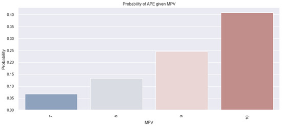 Starting from this model, let us assume that we have a patient with an MPV of 8 fl; applying the above mathematical formula results in a score of −1.91. To be able to interpret this result as a probability, we apply the following equation: . So the probability of the patient with an MPV of 8 fl is 0.14, representing a 14% chance of having APE. The results obtained by applying the above-mentioned mathematical formula are clearly illustrated in the figure below (Figure 3), which shows that there was a tendency for the probability of having APE to increase as the MPV value increased (41% probability for an MPV value of 10 fl versus 14% for an MPV value of 8 fl).