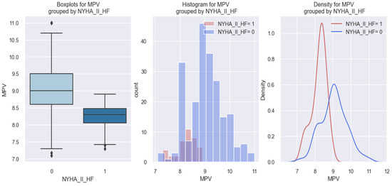 Compared to patients with class IV NYHA HF or acute pulmonary edema, in patients with class II NYHA HF, the data results were on the opposite side. Patients with class II NYHA HF (1) had a lower MPV value compared to those without class II NYHA HF (0). These data are presented in Figure 5, in which we can observe that patients with class II NYHA HF (1) tended to have a lower MPV value (below 9 fl) compared to those without class II NYHA HF (0).