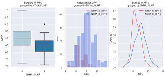 Similar results compared to patients with class II NYHA HF were also obtained in patients with class III NYHA HF who had lower MPV values compared to those without class III NYHA HF. These data are represented graphically in the figures below (Figure 7 and Figure 8). For example, in all three graphical representations from Figure 7, we can observe that patients with class III NYHA HF (1) had MPV values below 9 fl compared to those without class III NYHA HF (0).