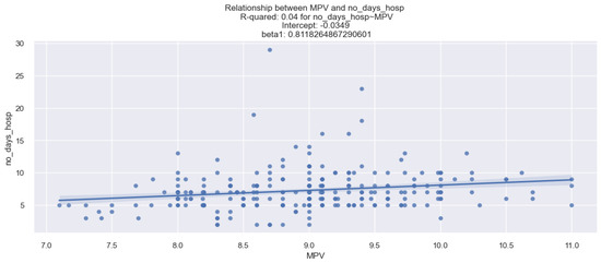 From the data in the table above, we observe the following: (1) an R-square of 0.038 means that 3.8% of the variation in hospitalization days is explained by variation in the MPV value; (2) the coefficient for MPV is 0.8118, which means that when MPV increases by one unit, the number of days of hospitalization increases, on average, by 0.81 days; (3) the fact that the p-value associated with the coefficient for MPV is 0.002 means that we are not wrong when we say that an increased value of MPV is associated with a higher number of days of hospitalization. This phenomenon is also exemplified in the figure below in which the linear relationship between MPV and the number of days of hospitalization is represented, where a dot represents a patient described by the MPV value and the number of days of hospitalization. From the graphic representation (Figure 9), we can observe that there was a slight tendency for the number of days of hospitalization to increase as the MPV value increased.