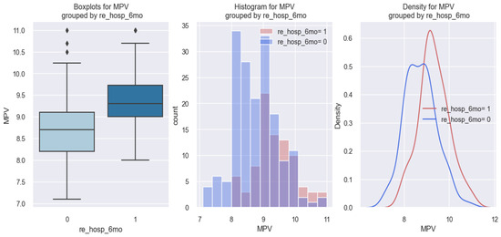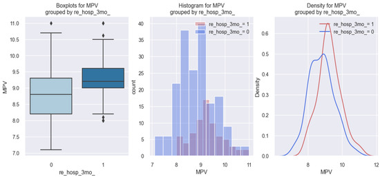 As shown by the statistical results regarding the relationship between MPV and 3-month rehospitalization, significant results were also found regarding the relationship between the MPV value and 6-month rehospitalization, revealing the fact that patients with HF who were rehospitalized at 6 months had a higher MPV value compared to those who were not rehospitalized at 6 months. These results are better illustrated graphically in the figure below (Figure 12), in which it can be observed in all three graphs that patients with HF rehospitalized at 6 months (1) had a higher MPV value (over 9 fl) compared to those who were not rehospitalized at 6 months (0) and who had MPV values below 9 fl.
