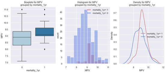 At the same time, this phenomenon is illustrated in the graphs represented in Figure 15, in which it can be observed that patients with HF who died at 1 year (1) had a higher MPV value (over 9 fl) compared to those who did not die at 1 year (0).