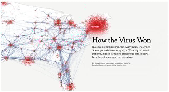 Interactive data visualization has advantages in telling stories related to data, especially in making extensive, complex data more visible and attractive simultaneously. Many news websites, such as The New York Times, The Economist, and BBC News, increasingly use interactive information graphics to explain complex information in a clear and concise manner, such as the White House healthcare plan or the Chilean earthquake. Figure 1 shows a data journalism project created by the New York Times: the report How the Virus Won combines text with interactive graphics, animated simulations, and more to reveal how the epidemic got out of control intuitively. Ancker et al. consider interactive data visualization to be an innovative news element that is more engaging, interesting, and participatory than static data visualization [1].Web-based data visualization formats provide users with the opportunity to interact with charts and graphs by selecting and manipulating particular charts and graphs at any given time [2]. And previous studies have indeed shown that users respond well to graphical representations of the data they are allowed to process [1]. Therefore, it is more likely that data visualization will be successful in affecting user perceptions and attitudes if it can engage users with its interactive interface—as users interact with the various features, they may attribute a positive perception to the website, which may lead to a positive attitude toward its contents [3,4,5,6].