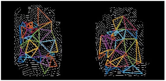 The algorithm namely, the Delaunay triangulation graph (DTG) is introduced for handprints using minutiae or minutiae-like key points, and it focuses on an automated alignment of geometrically transformed images. Minutia-based triangles are generated from Delaunay triangulation. Now, this preliminary process estimates the possible set of matched triangles (likelihood) using a simple minutiae-based feature set as shown in Figure 3. By observing the figure, these sets of matched triangles cannot be the final matched triangles. However, existing past work considered these triangle sets as final matched triangles.