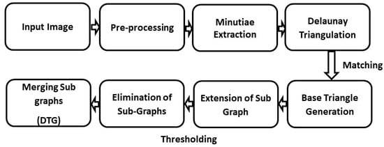 Therefore, they can be checked further in the subsequent step by accepting or discarding the triangles using a validation mechanism because, in latent and contact-based hand prints, the triangles matched in the initial step may not be reliable due to the dispersion of minutiae. Therefore, this process requires further extension. The algorithm consists of following phases: (i) base triangle generation; (ii) extension of sub-graph; (iii) elimination of sub-graph; and (iv) merging of sub-graphs to form the DTG. The overall process of the DTG algorithm is illustrated in Figure 4.