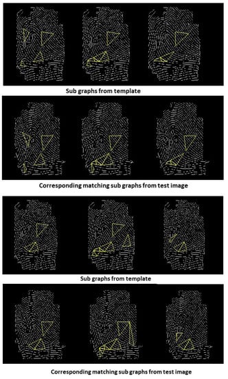 Figure 5. Phase 2: graphs generated in template image and their matching counterparts in test image are shown. Each sub-graph is started from initial base triangle (initial matched triangle) and extended with other triangles if there is spatial connectivity among other matched triangles. Any sub-graph which consists of a threshold number of minutiae is selected as a reliable sub-graph and the remaining sub-graphs (with fewer minutiae) are discarded.
