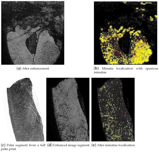Minutiae are a common feature used for palm print identification [47], while they played a role in latent prints, and they can be extracted automatically [48]. However, the presence of a load of minutiae is a major issue in latent prints due to the extreme lower image quality similar to Figure 2, which requires a larger processing time for handling them. Another issue is that there may be an overlap between the pair of prints during the match, which can lead to diminishing the system’s efficiency. Further, manual marking of the minutiae is also practiced in latent prints.