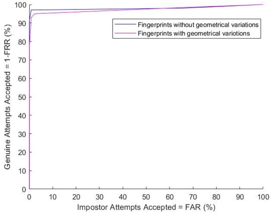 Figure 8. The comparison between FAR vs. GAR in fingerprint images with and without geometrical variations.